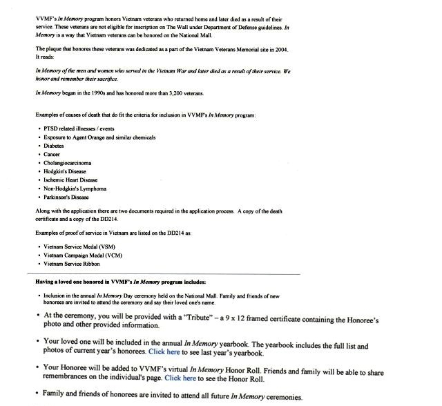 READ THE FOLLOWING INFORMATION ON THE IN MEMORY PROGRAM ![]() To Apply Download and Fill out Form FAQ on Form For addional information visit site www.vvmf.org/InmemoryProgram |